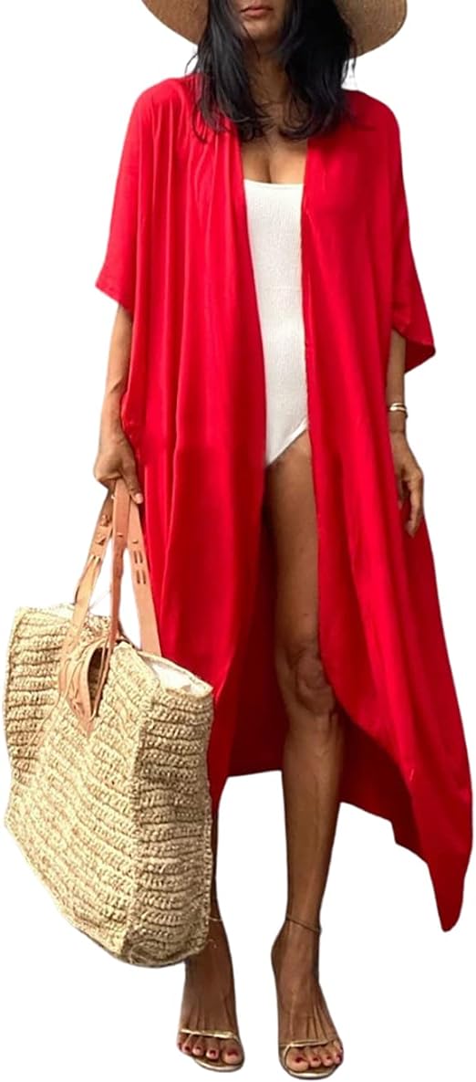 Bsubseach Women Solid Red Long Beach Swimsuit Cover Ups for Swimwear Sexy Bikini Beach Kimono Cardigan, Red, XXL