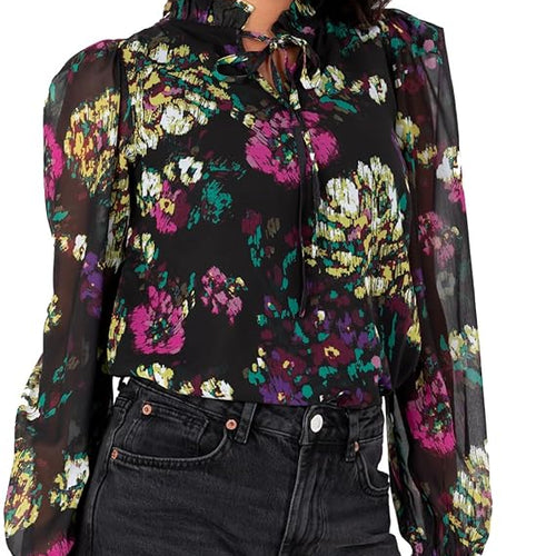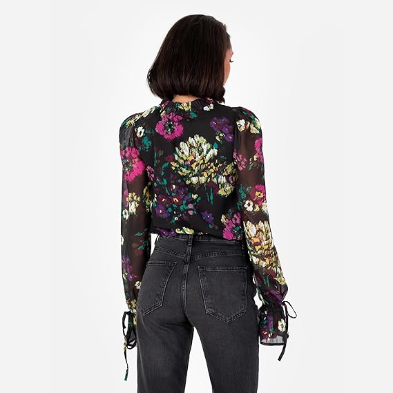 - Floral Print Blouses: The women's blouse features a sophisticated tie-neck and long sleeves, with the tie detail echoed on the ruffled design cuffs. This smart-casual blouse is available in monochrome or a black base multicoloured floral print.