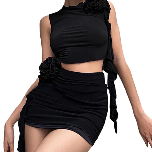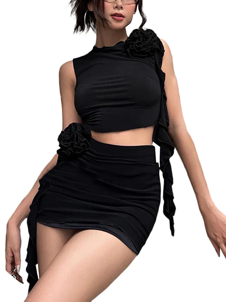 • Features: Women's 2-piece skirt, sleeveless cropped tank top, solid color, crew neck, decorative flower and ruffle fringe design, sexy two-piece suit, vintage fashion clothing, e-girl chic clothing, grunge style party club Pack.