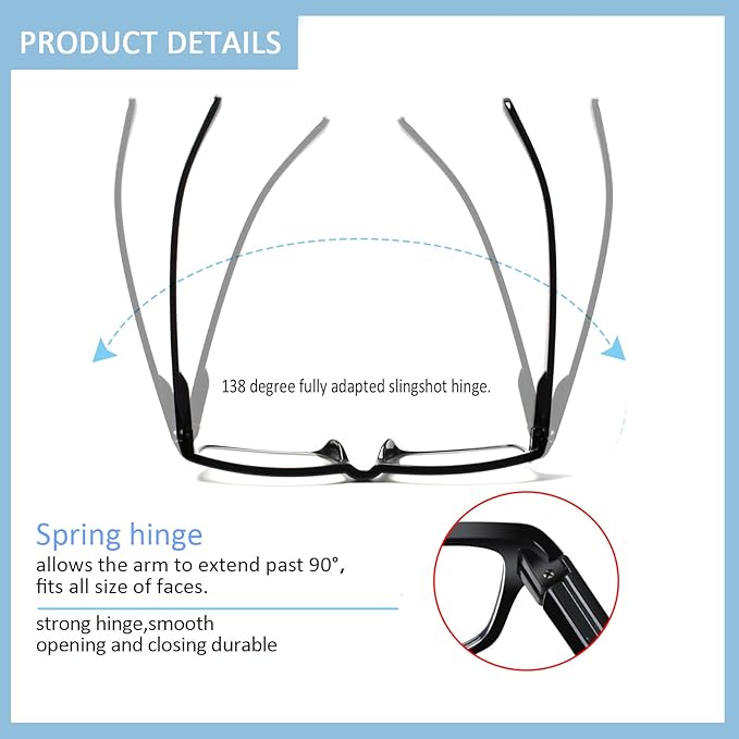 - 【Classic Unisex Design with Adjustable Spring Hinge】Classic design with spring hinge let the temples can open up to 25° outwards, suitable for any face shape. You can protect your eyes while looking stylish