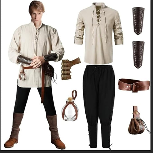 - Vintage Design: The pirate shirt features a V-neck drawstring neckline, stand-up collar, and adjustable length sleeves; the renaissance gothic trousers have an adjustable ankle band; the Viking belts can adjust to your needs. This medieval costume can be easily matched with accessories, making you look like a medieval man in no time
