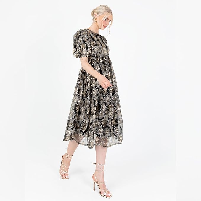Lovedrobe Women's Midi Dress Ladies Short Puff Sleeve Mesh Star Sequin Embellished Round Neck A-line for Party Cocktail Evening, Gold, 16