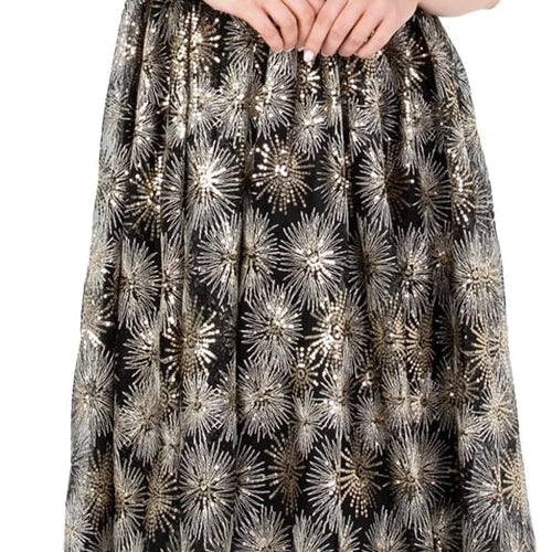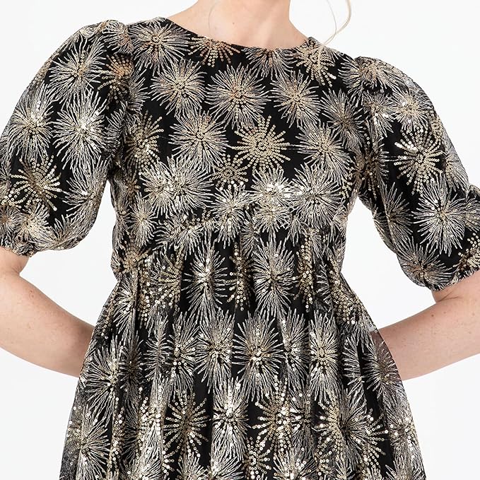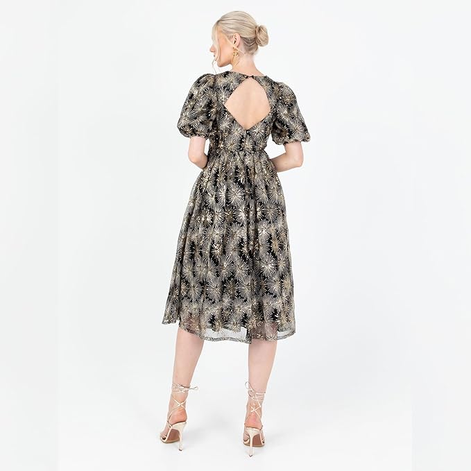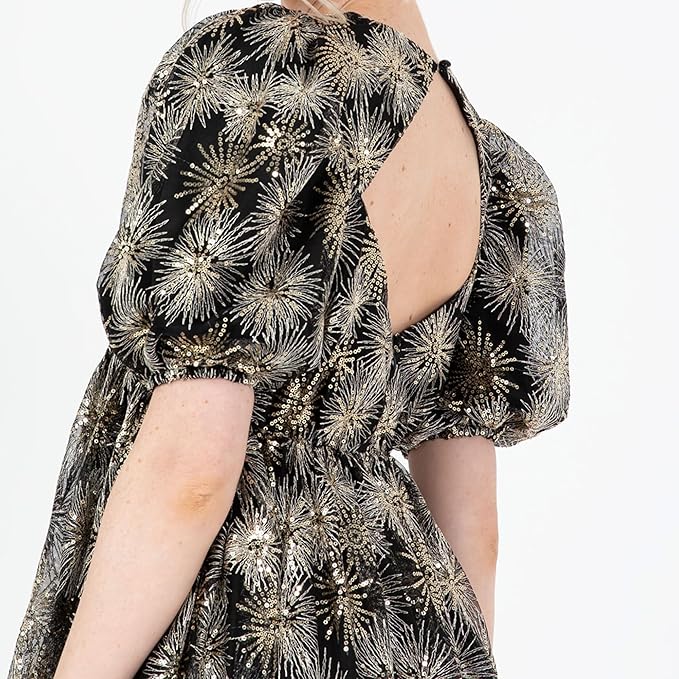 - WOMEN'S EMBELLISHED DRESSES: This embellished gold dress features short puff sleeves and round neckline. Metallic sequin embellishment in an attractive star design adorns the dress on a mesh overlay. A keyhole back finishes the elegant evening dress, making this piece a must-have item for your occasion-wear wardrobe this season.