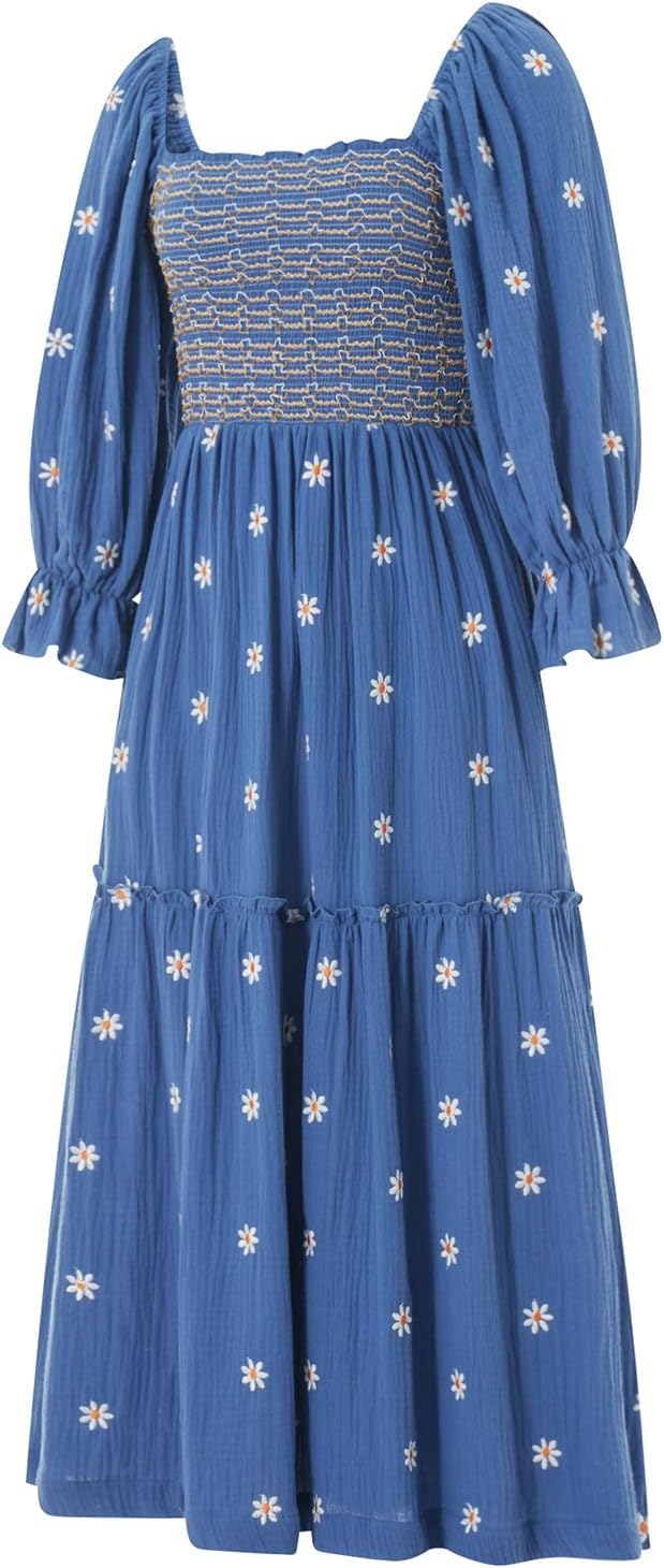 Yoisdtxc Women 's Smocked Square Neck A Line Flowy Maxi Long Dress Flower Print Half Sleeves Backless Embroidery Loose Swing Dress (Dark Blue, M)