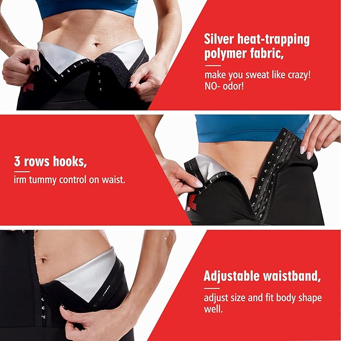 • HIGH TUMMY CONTROL PANTS: Kumayes sauna suit sweat workout legging is designed with comfortable elastic high waist and with adjustable waistband, 3 rows hooks in abdomen area, provide firm tummy control on waist, flatten stomach, contours your curves and streamlines your shape.You will love our anti-cellulite leggings once you put them on and experience a perfect combination of slim waist and slim thighs.