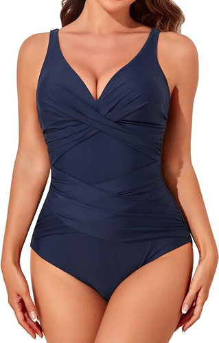 Smismivo Tummy Control Swimsuits for Women Slimming One Piece Bathing Suit Modest Padded Ruched Push Up Long Torso Curvy Shapewear V Neck Criss Cross Swimming Suits Full Coverage Swimwear (Navy Blue) XL
