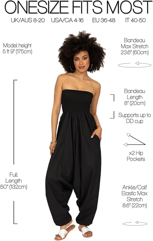 - SIZING FITS MOST WOMEN - U.K. 8-20 SIZES - Strapless harem jumpsuits are perfect for most women as the elastic bandeau and elastic at the ankles mean that women of almost all shapes, curves and sizes can wear this full-length jumper in style
