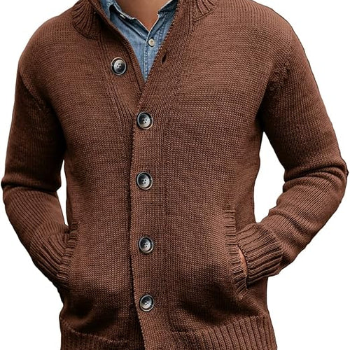 Gemijacka Mens Knitted Cardigan Stand Collar Sweater Button with Pockets Brown, L