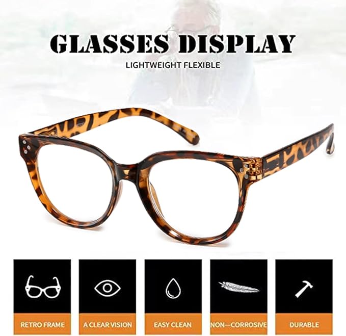 Oversized Frame Style: Fashionable oversized frame design and eye-catching thick frame style meet the needs of different people for personalized frame.Comfortable Spring Hinge: The spring legs can adapt to different face shapes, making the glasses comfortable to wear for a long time.Clear Vision: We all know that clear lenses can restore true colors, make your eyes see more clearly and truly, and clear lenses can help you see the world clearly.Incredible value: Put each reading glasses in your favorite reading point, whether it's a company, a room or a car, you can always reach for it.After-sale Service: If there is any problem with your reading glasses, please feel free to contact the seller. We will fix the problem until you are satisfied. (If you are not satisfied within 30 days, we can refund unconditionally).