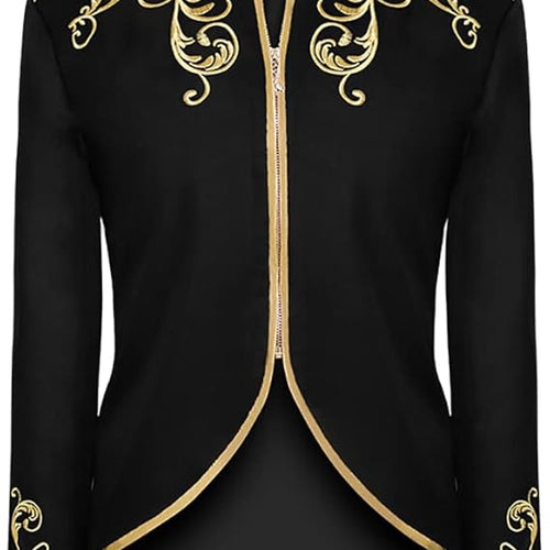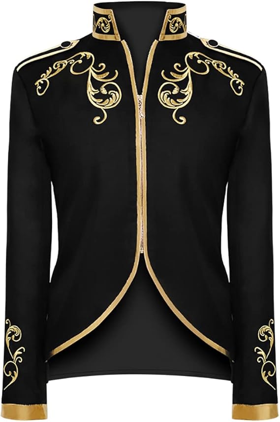 Men's Prince Coat: Men's Steampunk Vintage Tailcoat Jacket Gothic Victorian Medieval Halloween Costume Prince King Coat. The gold embroidered jacket for men goes perfectly with plain trousers to complete the vintage look. Once you put it on, others will be attracted to your beautiful look and charming temperament at the partyDesign: unique gothic steampunk tailcoat uniform for men. Stand-up collar, long sleeves, slim fit, military blazer with embroidered decoration. Asymmetrical high-low hem quickly breaks the dull costume and makes you more stylish and chic. Solid style shoulder flap with buttons gives the jacket a sturdy and elegant feel. The front zip makes it easy to put on or take off. Gold embroidery on the collar, chest and sleeves makes it very exquisite and luxuriousMaterial: our men's steampunk outfits are made of high-quality elastane and polyester, soft, lightweight and comfortable for the skin. Excellent workmanship, each medieval jacket is carefully handmade by experienced dressmakers. And makes you more attractive and charmingMen's must have Halloween costumes: a perfect tuxedo jacket for renaissance themes and rock parties, Halloween costumes, cosplay, masquerade, steampunk planning meetings, horror picture show, dance party, night club fashion show, leisure, wedding, school performance, comic con, photo shoot, etc. colonial costume costumes, etc. You will stand out from the crowd. Best Victorian frock uniform jacket for adult men / teenagers.Best gift: the best Halloween costume gift for your family, friends and yourself. Exclusive festive costumes or exclusive vintage fashion are also a popular and particularly suitable birthday gift. Be ready for Halloween. It can also be used as a beast outfit, circus director jacket, circus director costume, pirate captain's jacket, vampire costume, king costume, best riddler costume