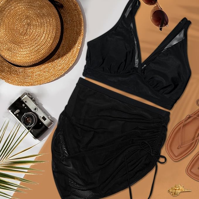 - Combination of Fashion and Slimming: This high-waist bikini package is designed with a mesh transparent V-neck and sarong, which has both fashion and sexy effects. The belly design and pleated details perfectly show your figure curve.