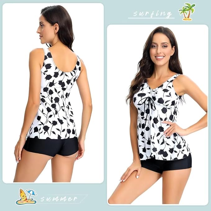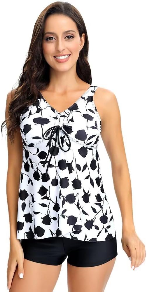 Sillictor Tankini for Women with Shorts Womens Swim Shorts and Top 2 Piece Ladies Swimsuits Boyleg Bikini Swimwear Swimming Costume Set for Bathing,Surfing,Breathable Quick Dry 2210, White Black Rose, L