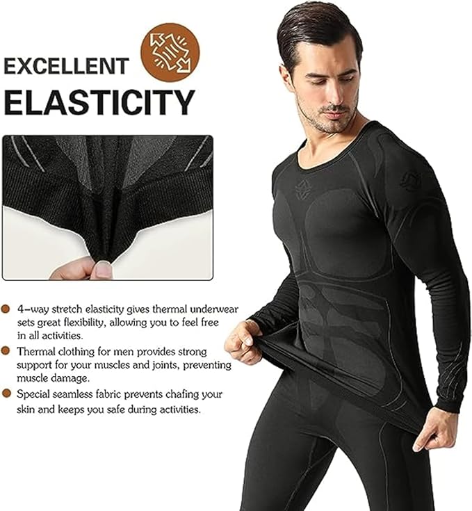 ♥ ERGONOMIC & SUPER COMFORTABLE: Crew ceck t-shirt, sports tights with wide elastic waistband for relaxed fit, streamlined design with flat-lock seams, comfortable base layer top and bottom for you in all seasons.♥ SUPER WARM & LIGHTWEIGHT: The thermal underwear mens set designed using double-seamless technology with top quality thermal properties. Designed with high quality fleece lining, the thermal underwear mens is windproof, it can keep you warm while running, cycling, hiking, skiing in the winter.♥ BREATHABLE & QUICK DRYING: Breathable and moisture wicking fabric is perfect to keep sweat away and dry fast, the thermal base layer men perfectly repel odors and unpleasant smells left behind from sweat and dirt, keep you dry and cozy. Machine washable and dry washable.♥ COMPRESSION & ELASTIC: Compression technology reduces muscle vibration during exercise, providing appropriate compression and support to enhance athletic performance and recovery speed. The elastic fabric, resistant to deformation, offers a soft and comfortable wearing experience, conforming to the body shape and improving freedom of movement.♥ WIDE APPLICATION: This thermal underwear men for cold weather is idea gear for all kinds of activities, such as training, rash guard, running, squat, weight training, cycling, skiing.