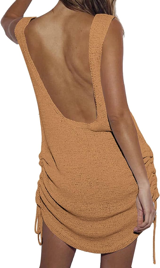 Baynetin Women Crochet Bikini Cover Up Backless Knitted Swimsuit Tank Top Summer Scoop Neckline Sexy Sleeveless Coverups Beach Tank Dress with Drawstring (Brown, One Size)