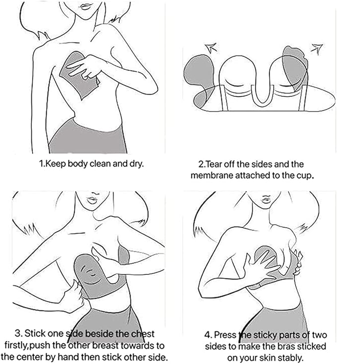 - IMPORTANT NOTE: Too much sweat will affect the effectiveness of the adhesive, so this invisible sticky bra is not suitable for using in high temperature outdoors or doing exercise. Clean your chest before wearing and make sure you don't use any body oil or lotion before sticking this to your skin or it won't stick at all.