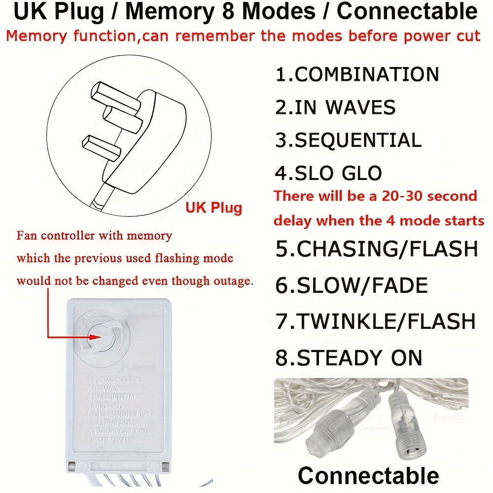 (1)combination (2)in waves (3)sequential (4)SLO GLO (Note: this mode will be a 20-30 second delay when starts) (5) chasing/flash (6)slow fade (7)twinkle/flash (8)steady on