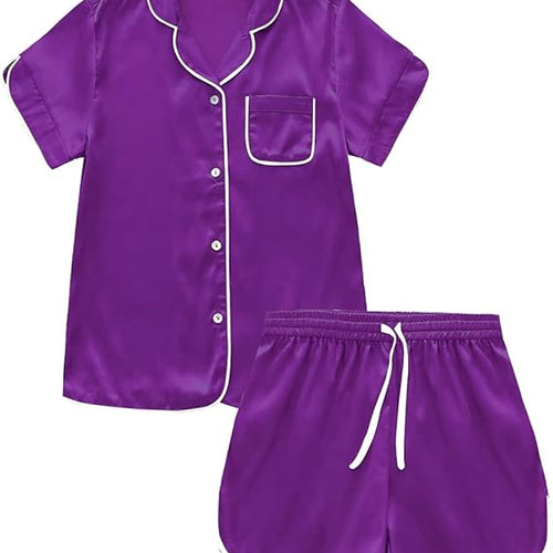 Alcea Rosea Kids Short Sleeve Silky Satin Pajama Set Button-Down Sleepwear Pajama Shorts Nightwear110-150(Purple,kids-120cm-5-6years)