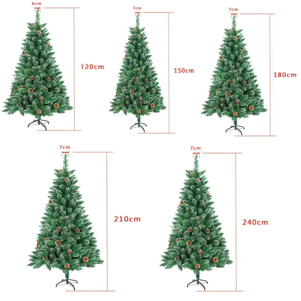 Details: Color: green with snow effect and pine cones. Available in five heights: 120 cm, 150 cm, 180 cm, 210 cm, and 240 cm. Width: around 60 cm, 75 cm, 90 cm, or 105 cm. Branch tips count: approximately 220, 367, 570, or 820. Material: PVC. PVC pine tree: Width: about 74 cm, 90 cm, 104 cm, or 116 cm. Branch tips count: roughly 236, 406, 700, or 986. Included in the package: 1 Christmas tree of your selection (with stand).